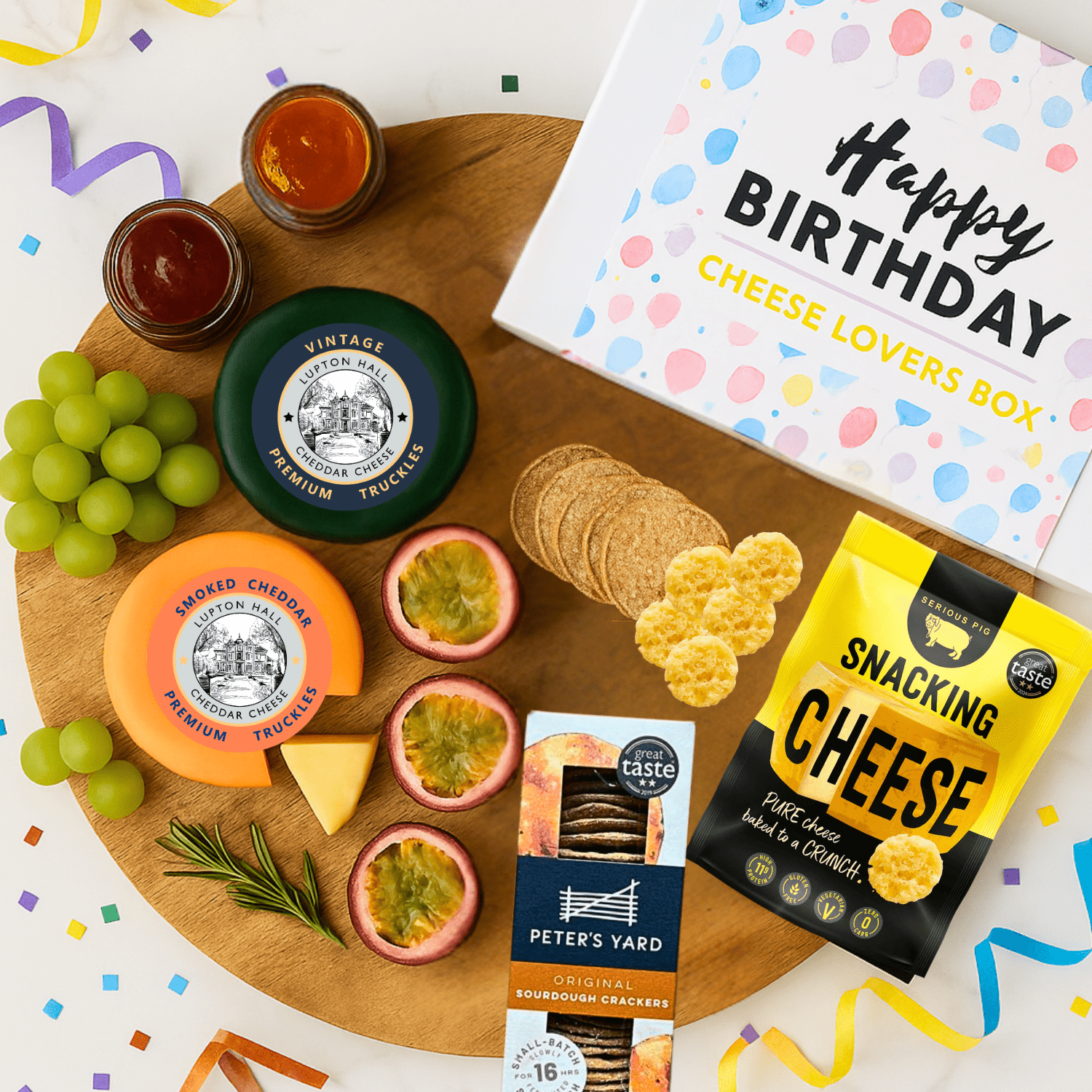 Presented in a premium magnetic-close gift box, this indulgent selection includes two rich 200g cheese truckles – a classic Vintage Cheddar and a smoky, full-bodied Smoked Cheddar. Pair them with our Cheeseboard Chutney and Caramelised Onion Chutney for the perfect flavour balance. Add in crunchy Peter's Yard sourdough crackers and a bag of savoury oven-baked Italian cheese bites, and you've got everything you need for a gourmet cheese night in.